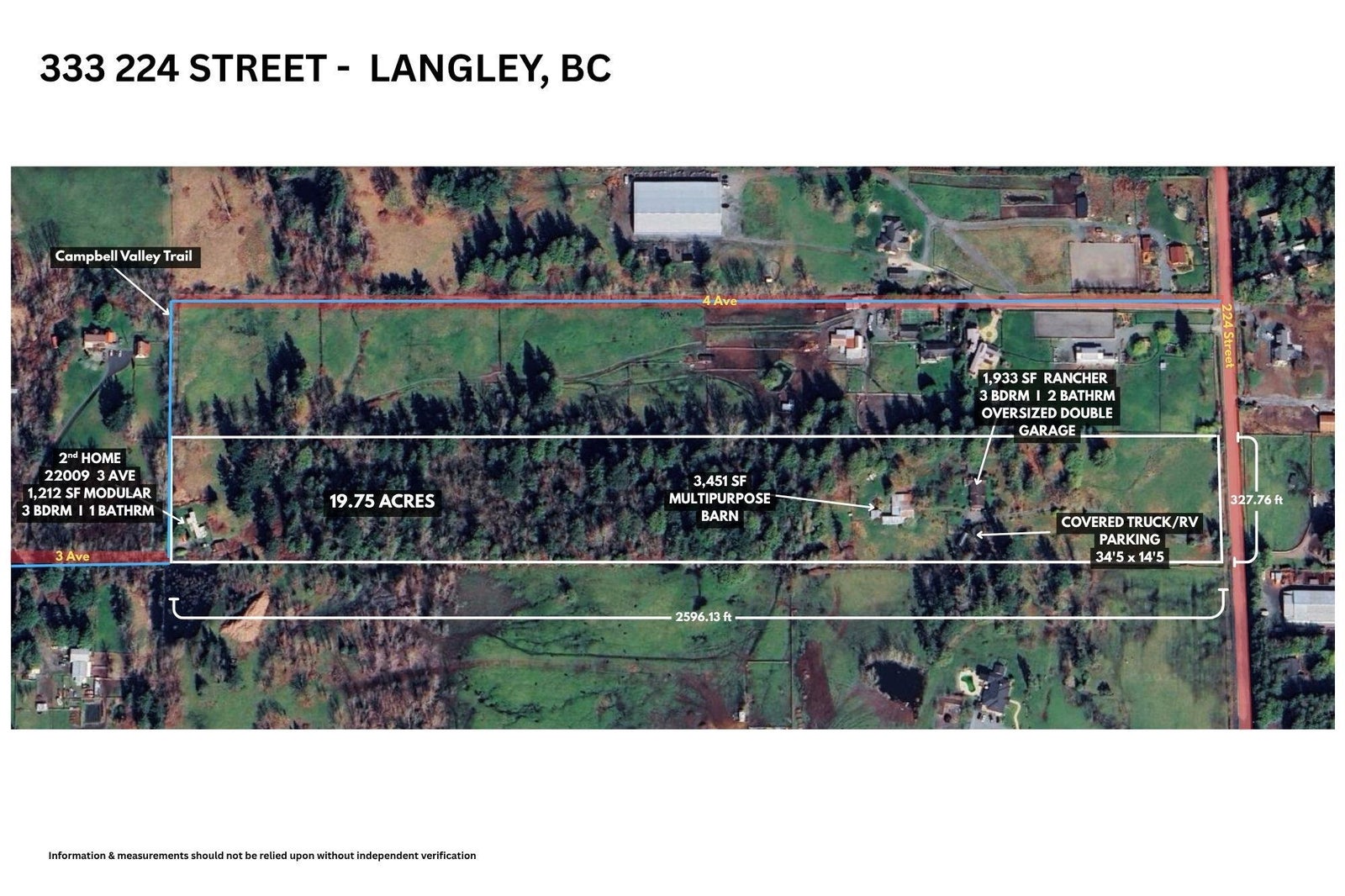 Gorgeous equestrian property in the heart of Langley's coveted Campbell Valley with 2 homes, 2 road frontages & barn/workshop. Breathtaking level 19.75 acres w/serene, parklike setting, fenced pastures & meandering trails through mature forests that connect to Campbell Valley Trail at the back of the property & at 224 St. Long winding driveway to charming custom spacious open plan 1933 sf 3 bedrm rancher w/double garage. Large multipurpose barn for equestrian use, workshop or versatile storage. 2nd road frontage & address is 22009 3 Ave w/spacious 1212 sf 3 bedrm & family rm modular w/its own ultra private yard (great building site). Enjoy the trails throughout the acreage & endless potential for equestrian pursuits or country living. A rare find in one of Langley’s most desirable areas!