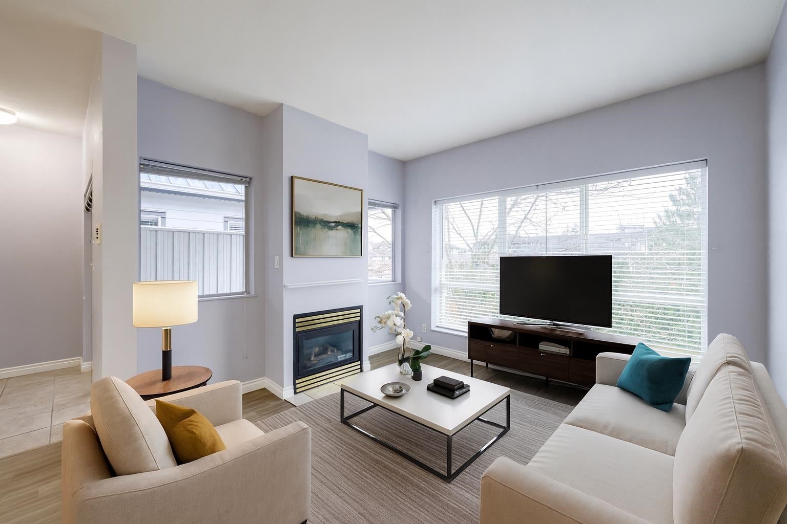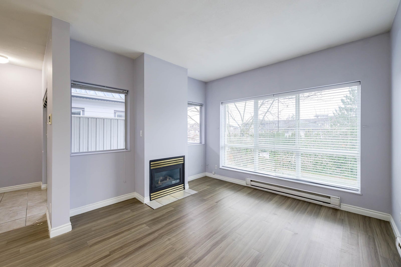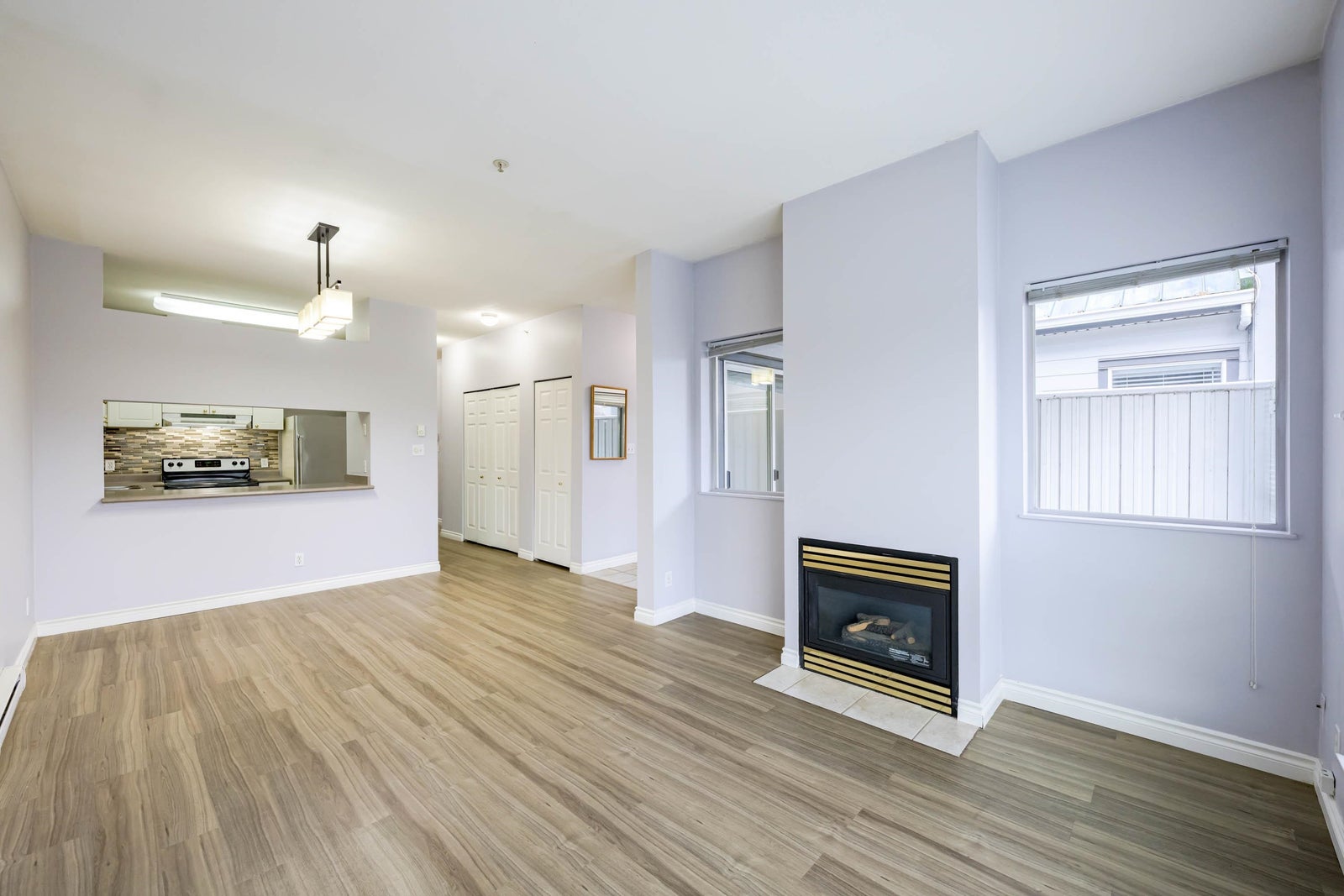 Mason Court offers townhouse-style living. Bright & spacious Top Floor 2-bedrm end unit w/9 ft ceilings & insuite laundry. Stylish, well-designed living in a boutique concrete (minimizes noise) building (residential above, commercial below) w/its own private ground floor entrance & a metal roof. Open-concept that seamlessly connects kitchen w/eating bar, dining area & living rm w/gas heatilator fireplace—perfect for comfortable everyday living or entertaining. 2 private North & South covered patios extend your living space & provide options for morning coffee, evening relaxation & container gardening. Rentals & pets allowed(no size or breed restrictions). Rare find w/low strata fees of only $290.75, great natural light & convenient location steps to everything & minutes to future Skytrain.