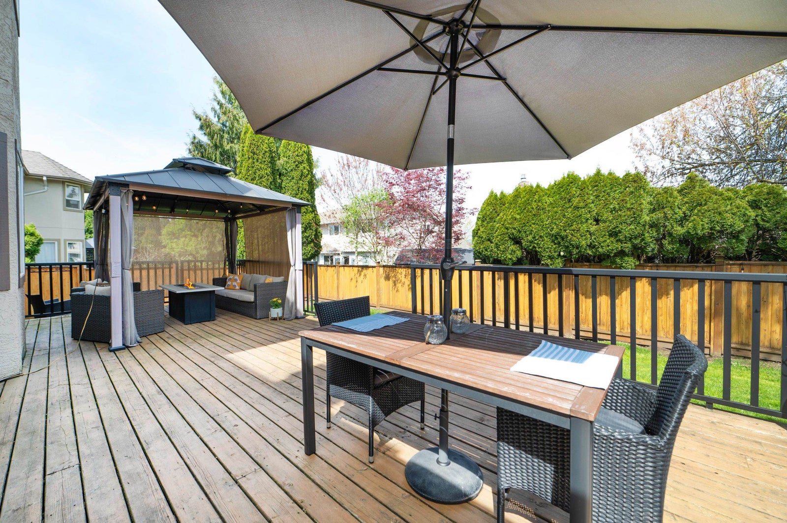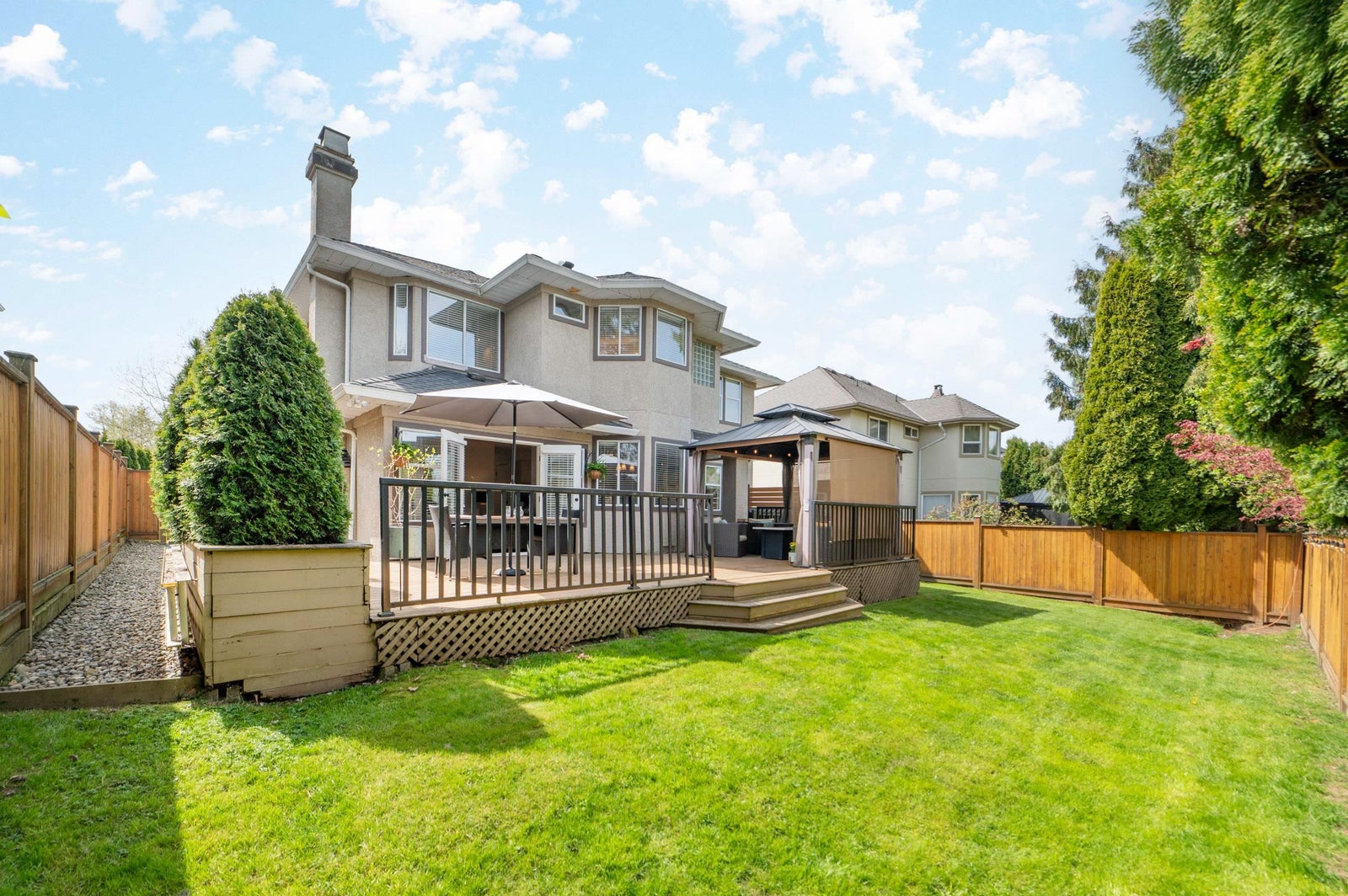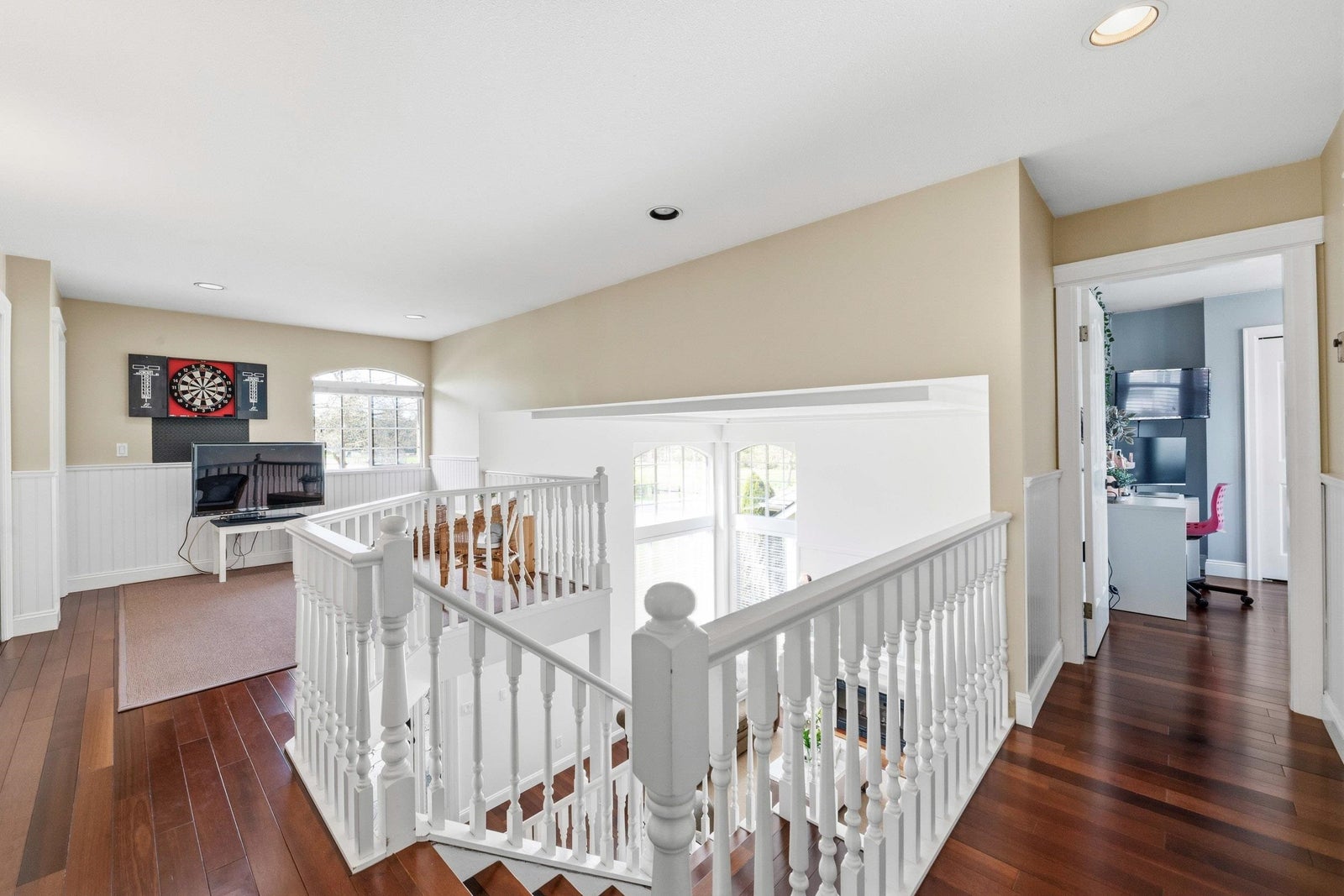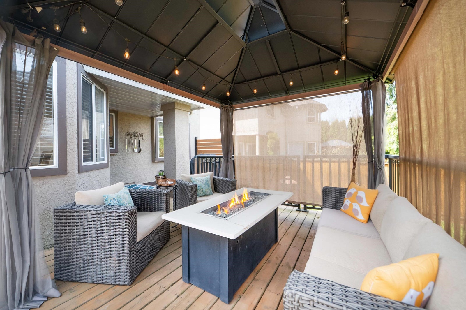 Fantastic location & outlook across from a beautiful park & steps to Alex Hope school. Beautifully updated 2507 sf former Forest Hills showhome boasting premium hardwood floors & Chef’s kitchen w/SS appliances, dual ovens & Travertine Tile floors open to family rm w/gas fireplace & French doors to large outdoor living area, gazebo, gas fire table & private rear yard. Living/dining rm combo w/gas fireplace. Den/bedroom on main. 3-4 bedrooms + den up - massive primary suite w/walk-in closet, jetted tub & oversized walk-in shower ensuite. The sprawling games room includes a wet bar rough-in, easily serving as a 5th bedroom. Located minutes from shops, restaurants, Walnut Grove Secondary, community center, library & nature trails -this home offers unparalleled space, refinement & convenience.